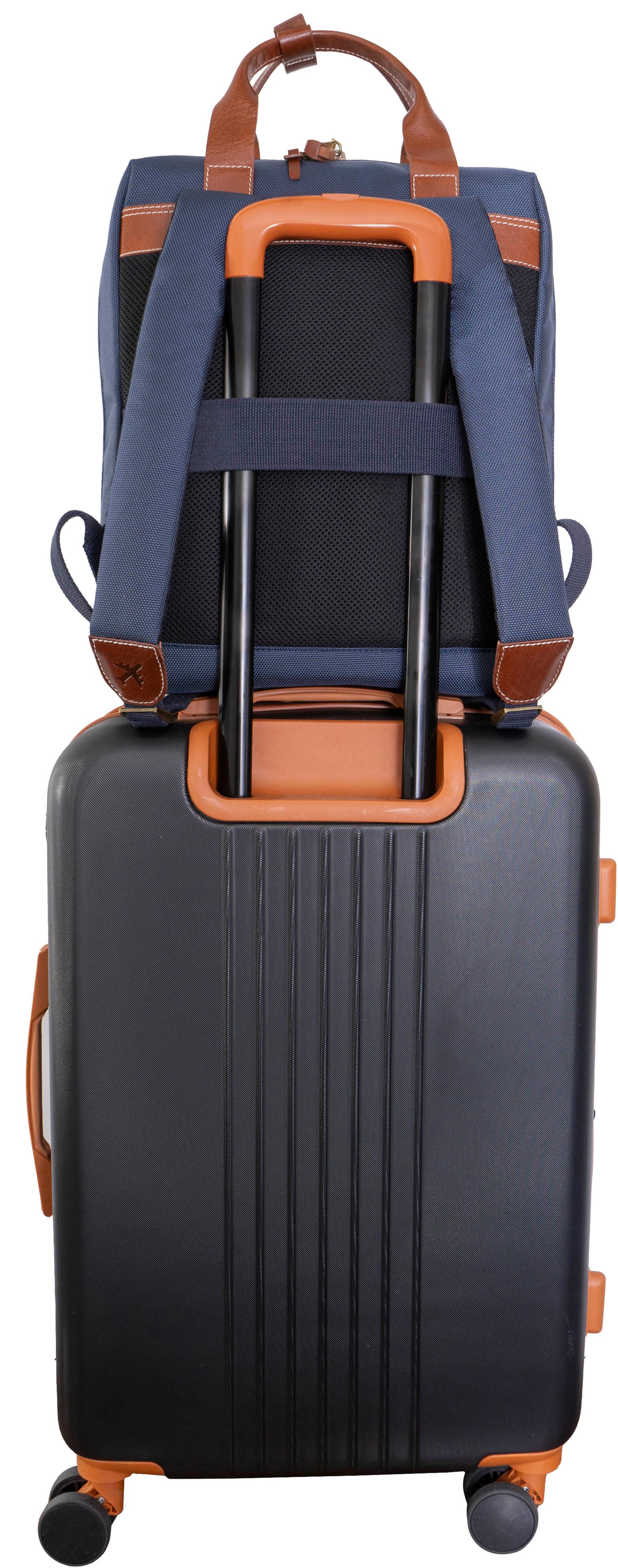The Metro 1680 Denier Nylon Backpack offers a perfect blend of strength and sophistication. Snap closure top handles & trim made of ultra soft Veg-Tanned Leather. Our rich brass zippers exude a modern look based in tradition. For your daily carrying comfort we have featured an ultra padded back wall with adjustable straps. Take this backpack from the office to the plane with our trolley add-a- bag feature. The ideal tech workbook Backpack both for travel and everyday use.