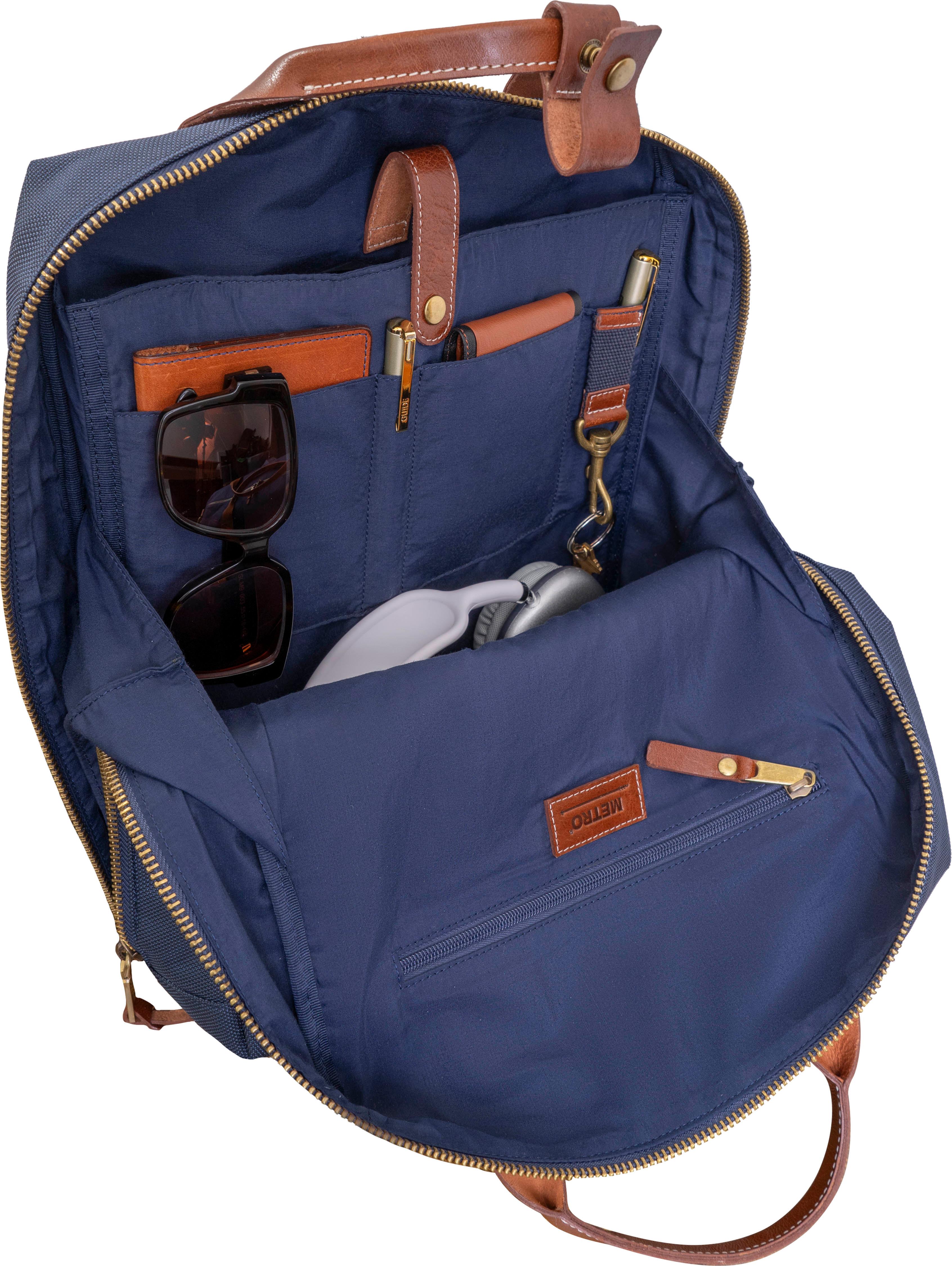 The 18” Metro 1680 Denier Nylon Backpack offers a perfect blend of strength and sophistication. It features a secure snap laptop sleeve (fits most laptops up to 15"), interior slip pockets, and a zippered compartment with a key hook for organized storage. The veg-tanned leather snap top handles and trim add a touch of elegance, while the front zippered compartment and padded back wall enhance practicality and comfort. The adjustable padded back straps with a burnished logo and the add-a-bag feature on the back wall make this backpack ideal for both travel and daily use.